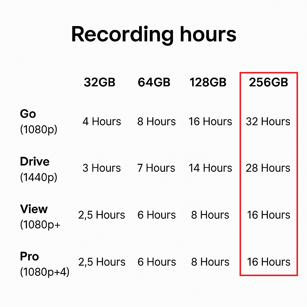 We recommend a Class 10 or higher Micro SD card with a capacity between 16GB - 128GB. Recording times will vary between different dash cams.