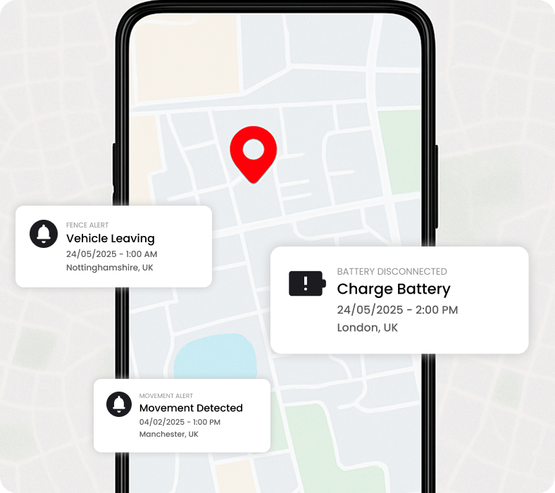 Get instant alerts for movement, battery disconnection, tow away events, and geo fence breaches